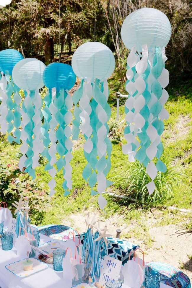 Floating lanterns mimic the gentle sway of sea creatures, while cascading paper tendrils add a whimsical touch.