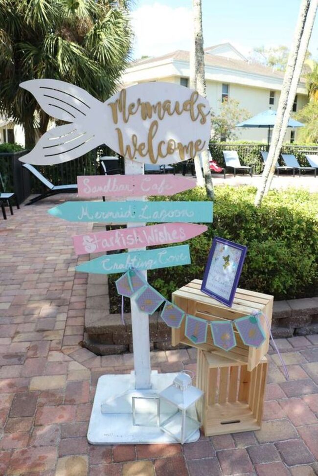 A mermaid-themed welcome sign offers a whimsical touch to any gathering. Soft pastel colors like aqua, pink, and lavender create an inviting atmosphere that sparks joy.