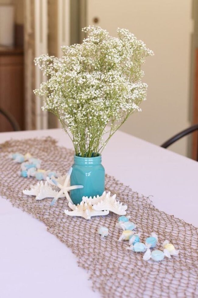 Coastal elegance defines this delightful table setting. A turquoise mason jar filled with delicate baby’s breath creates a refreshing centerpiece that draws the eye.
