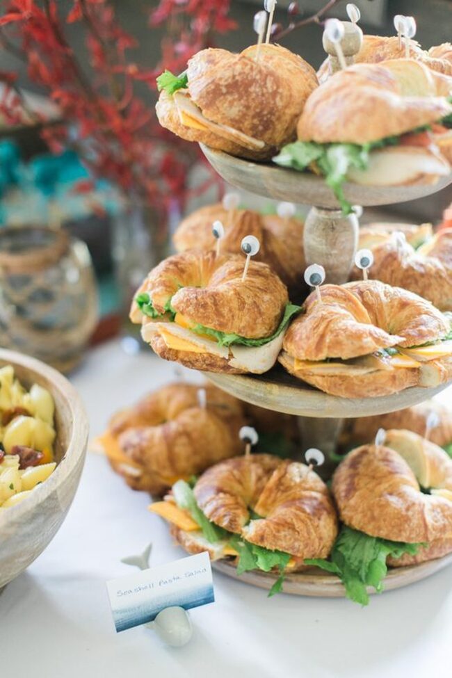 A tiered croissant display stands as a playful centerpiece, inviting everyone to indulge in flaky layers filled with fresh ingredients.