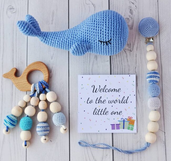 Featuring a soft, hand-crocheted whale in soothing blue tones, this collection radiates warmth and comfort.