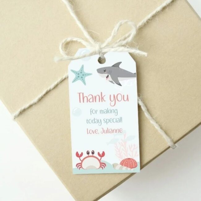 A beach-themed gift tag captures the essence of summer vibes with its playful ocean motifs and soft pastel colors. Featuring a charming shark, crab, and starfish alongside whimsical coral designs, this tag adds a delightful touch to any present.