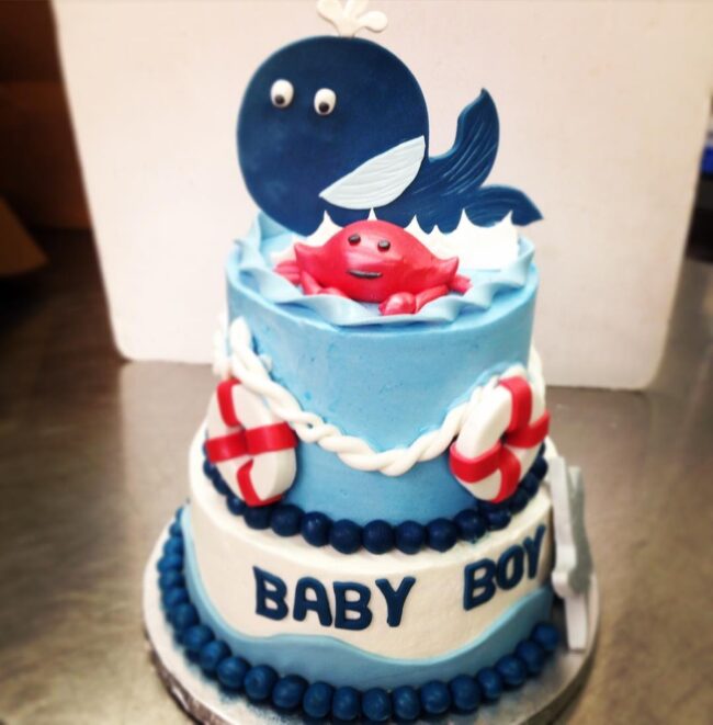 A whimsical baby shower cake features a delightful ocean theme, combining soft shades of blue and white to evoke serenity. The playful whale atop the cake adds an element of fun, while the bright red crab brings warmth and cheer.