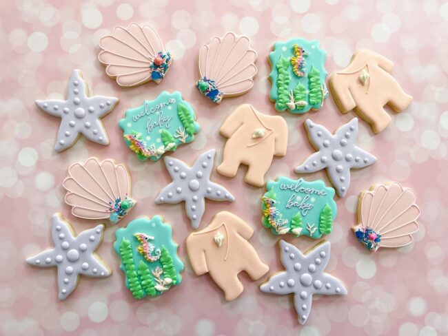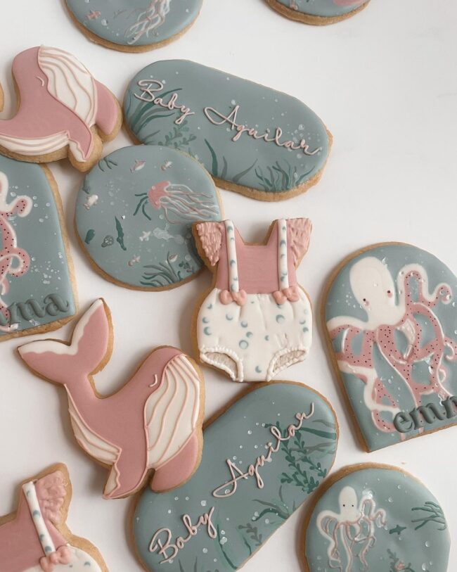 Intricate designs featuring playful sea creatures such as jellyfish and whales enhance their appeal, making them visually stunning. Each cookie is adorned with delicate hand-piped details that invite admiration while offering a taste of creativity in every bite.