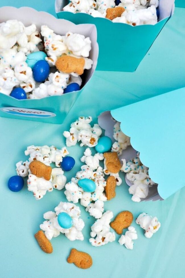 Snack mix magic combines fluffy popcorn with colorful candy-coated chocolates and playful cookie shapes for a fun treat. The bright blue hues pop against the soft white, creating an inviting visual appeal that draws you in.