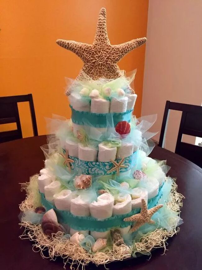 A beach-themed diaper cake serves as a stunning centerpiece for any baby shower. Layered with soft, fluffy white towels and adorned in soothing aqua hues, it radiates warmth and freshness.