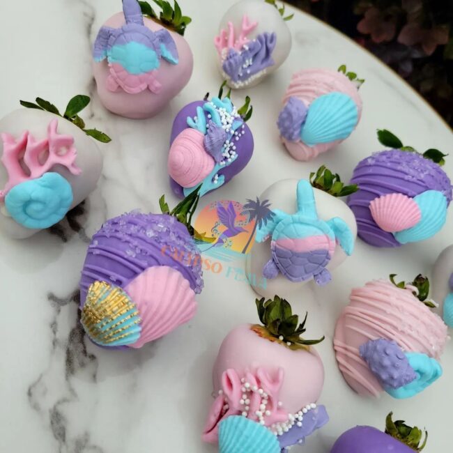 Underwater fantasy treats are a delightful blend of whimsy and artistry. These strawberries, adorned with pastel-colored shells and marine motifs, instantly transport you to the ocean’s depths.