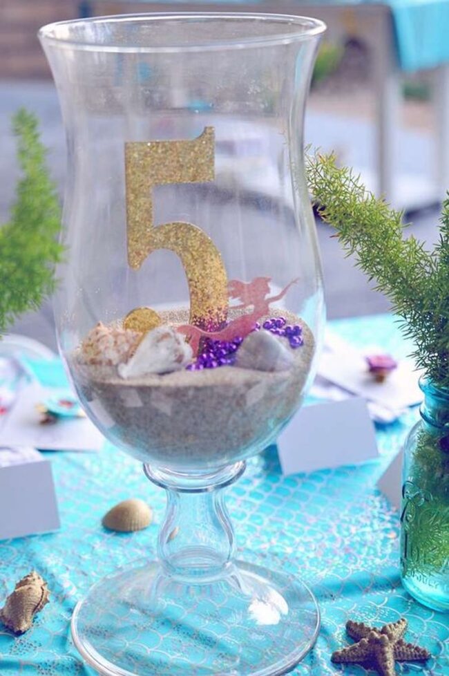 A shimmering number five glitters at the center, hinting at a special occasion. Accents like sparkling beads add depth while tiny figurines evoke playful seaside adventures.