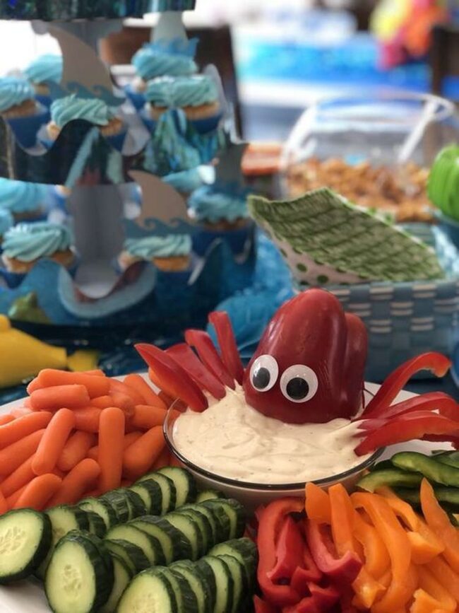 Picture an octopus crafted from a red bell pepper, its tentacles made of colorful veggie strips like carrots and peppers, creating an inviting centerpiece.