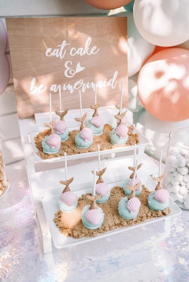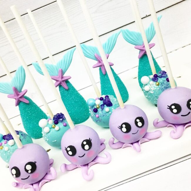 Mermaid-themed cake pops are a whimsical delight that transport you to an underwater world. With shimmering teal and vibrant purple hues, these treats catch the eye instantly.