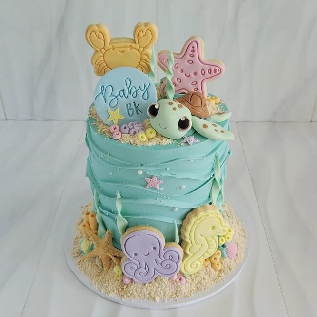 Underwater wonder is a cake design that transports you to the ocean's depths with its enchanting palette of soft blues and sandy neutrals. The textured frosting mimics gentle waves, while adorable sea creatures like starfish and turtles add whimsy.