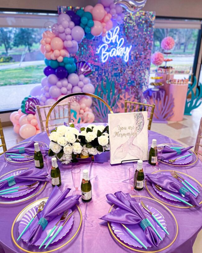 A whimsical baby shower theme captures joy and excitement, combining soft pastels with eye-catching metallics. Think shimmering purple tablecloths paired with golden accents that dance under the light, creating a festive atmosphere.