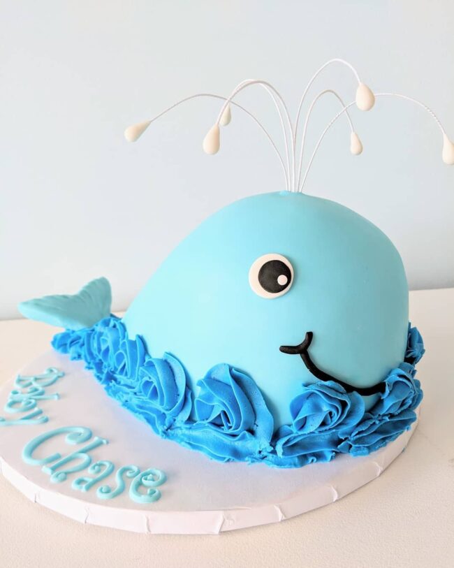 A whale-themed cake captivates with its cheerful design and soft, ocean-inspired hues. The smooth blue frosting creates a delightful base, reminiscent of serene waters, while whimsical details like the playful eyes and delicate fondant waves add charm.