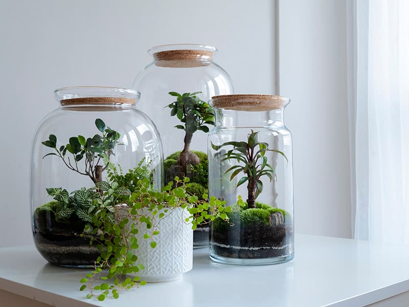 You’ll need a large glass container or cabinet, a lot of planning, and knowledge about terrarium plants. Moss is always a great idea, and you can fill in the blank spots inside the terrarium with it.