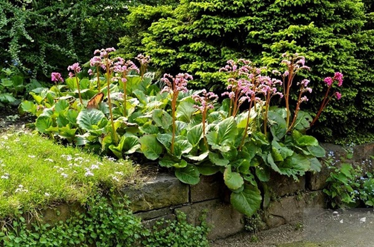 Heart-Leaf Bergenia offers tough, heart-shaped leaves and clusters of pink or white flowers in early spring. This hardy perennial is ideal for edging walkways, providing year-round interest with its bold foliage.