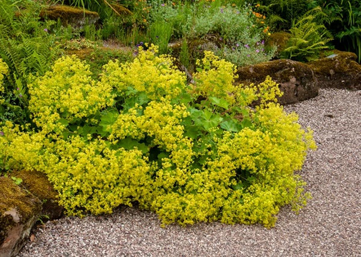 Lady’s Mantle features fan-shaped leaves with a unique scalloped edge, paired with clusters of small green-yellow flowers. This plant brings an understated elegance to walkways, offering a soft texture that contrasts beautifully with more structured plants.