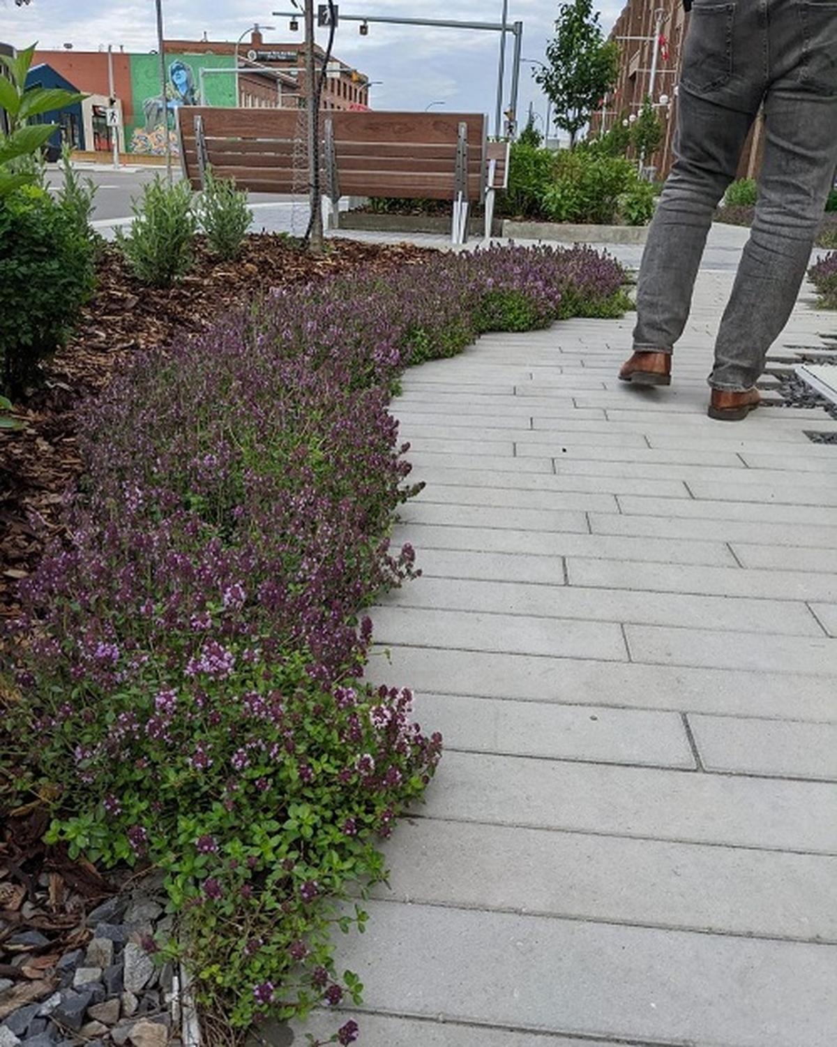 Creeping Thyme forms a dense, aromatic mat of green foliage that softens the edges of walkways. Its clusters of small pink or purple flowers bloom in the summer, adding a subtle pop of color.
