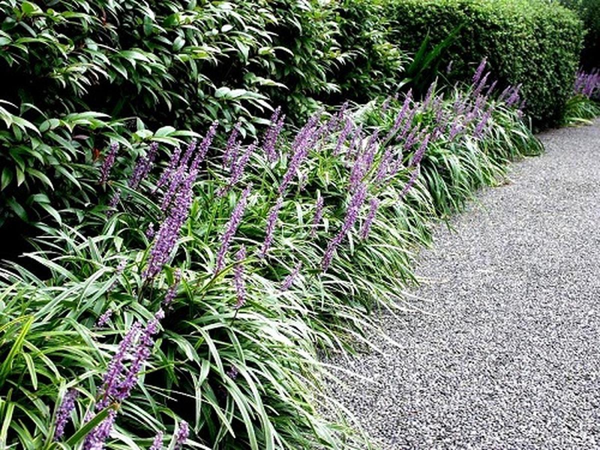 Liriope, with its spikes of purple or white flowers, adds a splash of color to garden borders and walkways. Its mounding habit and grassy texture create a tidy, structured appearance.