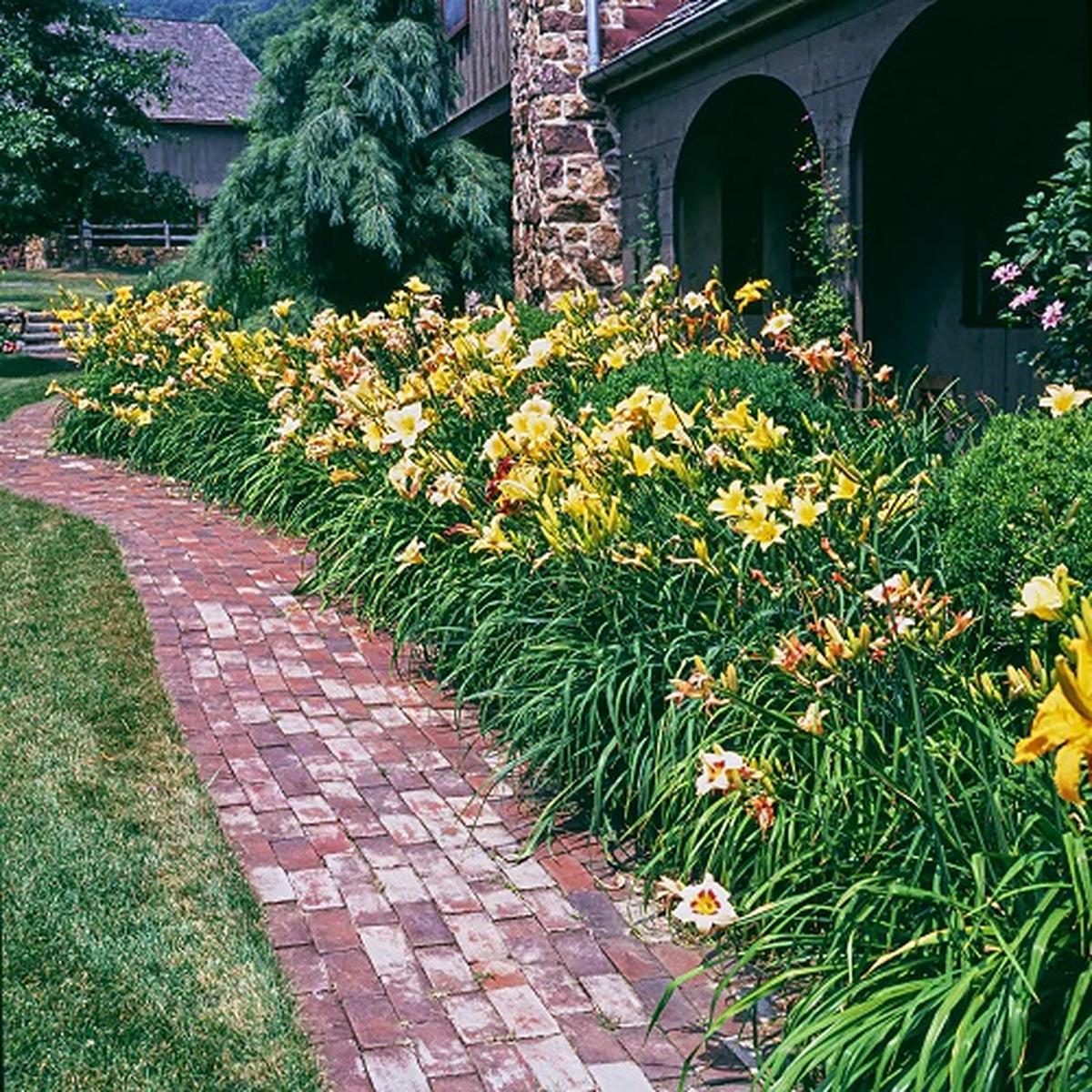 Daylilies are sun-loving perennials that bloom in a wide array of colors, including yellow, orange, red, and pink. Their long, arching leaves and bright flowers make them ideal for lining sunny walkways.
