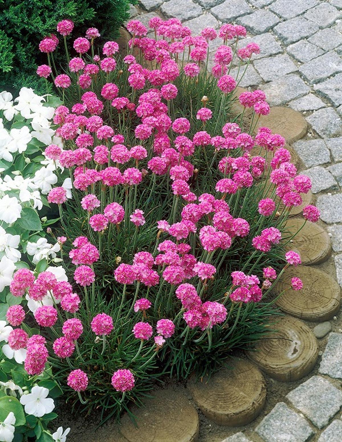 Sea Thrift creates clumps of grass-like leaves that add texture to the edges of walkways. Its globe-shaped flowers in shades of pink or white appear on tall stems, providing vertical interest.